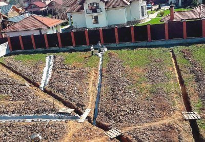 Устройство системы представляет собой канавы с песчано-щебеночной подушкой, на которую укладываются перфорированные трубы. Сооружение засыпается щебнем и грунтом. Чем больше объем стоков, тем больше будет площадь поля. При расчете учитывается коэффициент водопроницаемости почвы. От каждой трубы наружу выводится вентиляция.